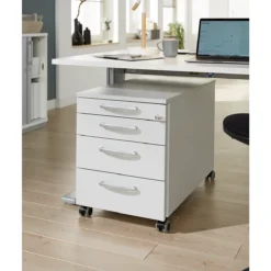 Ihr Anstellcontainer soll geräumig sein, über eine praktische Einteilung verfügen und ideal auf den Schreibtisch abgestimmt sein? Dann her mit dem Anstellcontainer BARI mit vier Schubladen und Materialauszug.