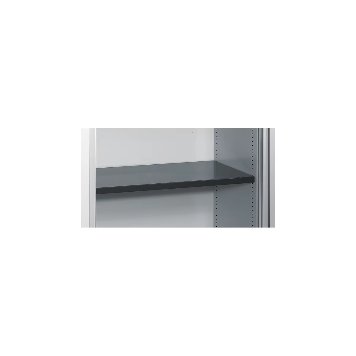 Stahl-Rollladenschrank Omnispace, als Sideboard, Korpus aus stabiler Stahlkonstruktion mit hochwertiger Einbrennbeschichtung für hohe UV-Beständigkeit, mit Kunststoffgleitern als praktischer Schrank- und Fußbodenschutz, hohe Flexibilität der Inneneinrichtung durch Höhenverstellbarkeit im 15 mm Raster, Türen aus durchgehenden, flexiblen Kunststoff- Lamellen (Polypropylen) in Leichtlaufschienen, mit Aluminiumschlossleiste und praktischer Griffmulde für einfache Bedienung, 3 Einlegeböden aus Stahl, lackiert, mit hoher Traglast von 50 kg, 1 Drehzylinderschloss mit 2 Schlüsseln, 1 integrierte Niveauregulierung bis 10 mm, bequem von innen justierbar, Maße (H x B x T): 1345 x 800 x 420 mm, Korpus: RAL 7035 Lichtgrau, Rollladen: RAL 7021 Schwarzgrau, Inneneinrichtung: RAL 7021 Schwarzgrau