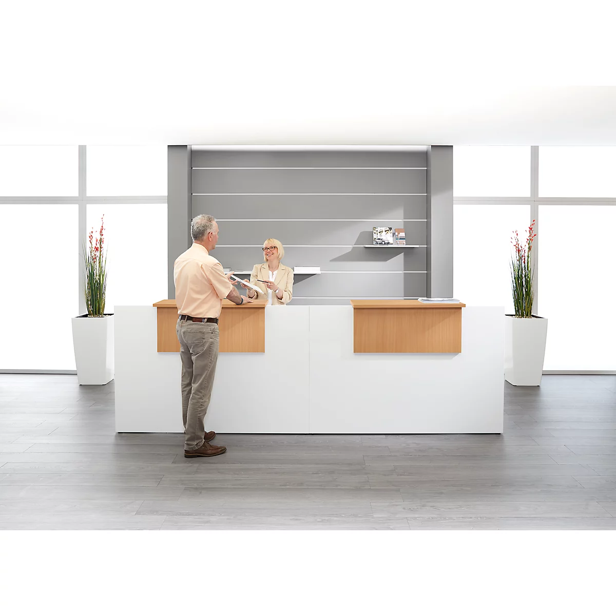 Die moderne Empfangstheke Come-In ist ein gerades Thekensystem und bietet zwei Ablagen in fünf verschiedenen Dekors. Wahlweise in den Breiten 3200 mm oder 3600 mm bestellbar, kombiniert die Empfangstheke Come-In praktische Funktionen mit frischem Design.