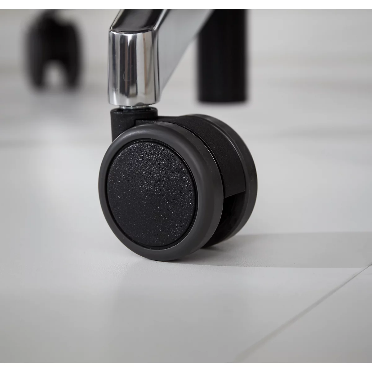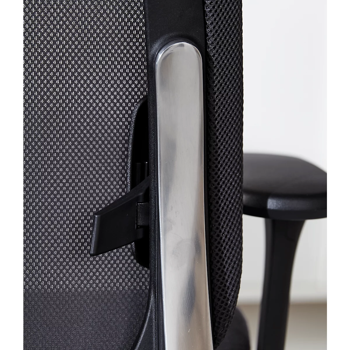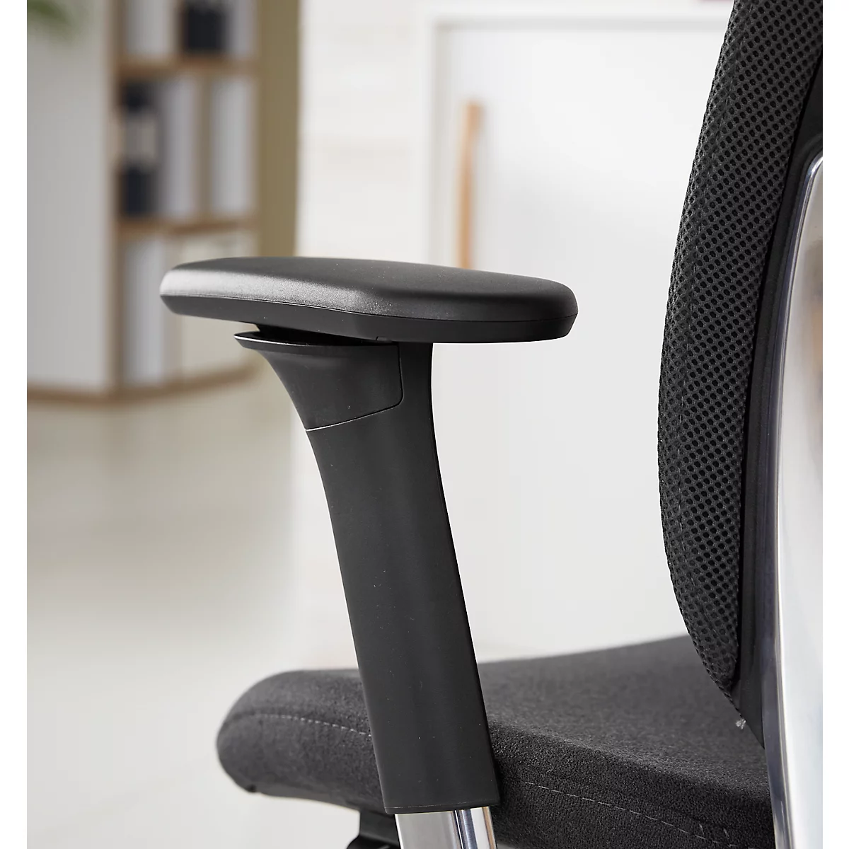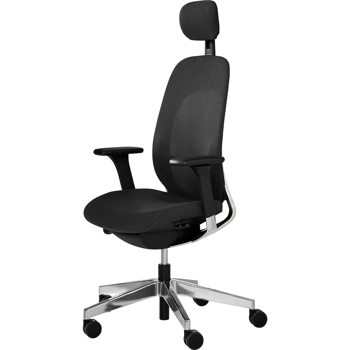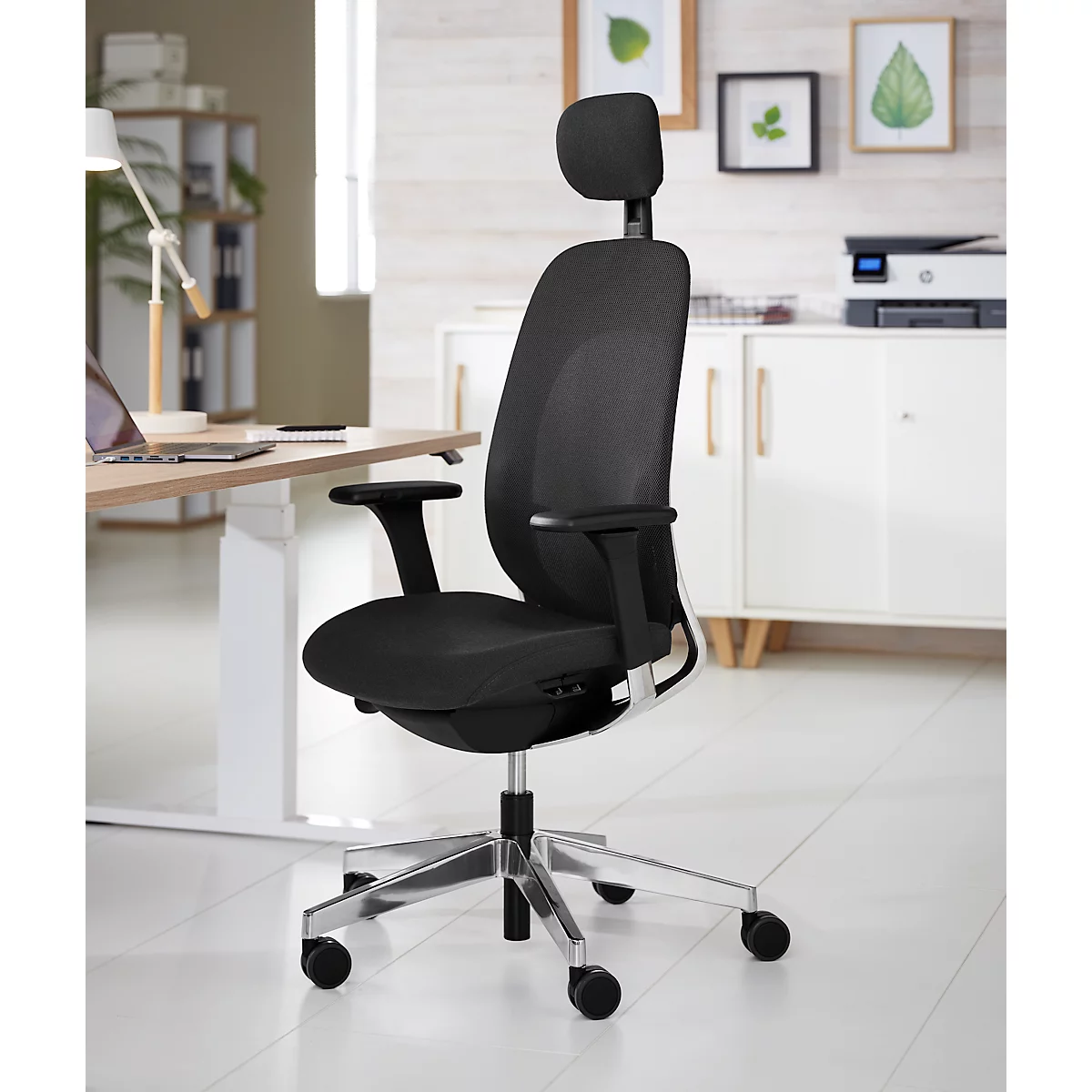 Für eine zusätzliche Entlastung des Nackens und der Schultern sorgen die höhenverstellbaren sowie breiten- und tiefenverstellbaren Armlehnen, auf denen Ihre Arme bei Schreibtischarbeiten bequem abgelegt werden können. Das ansprechende Design wird durch ein Fußkreuz aus poliertem Aluminium abgerundet. Durch die Verwendung von lastabhängig gebremsten Sicherheitsdoppelrollen können Sie den Stuhl optimal auf Fliesen oder Laminatböden verwenden.
