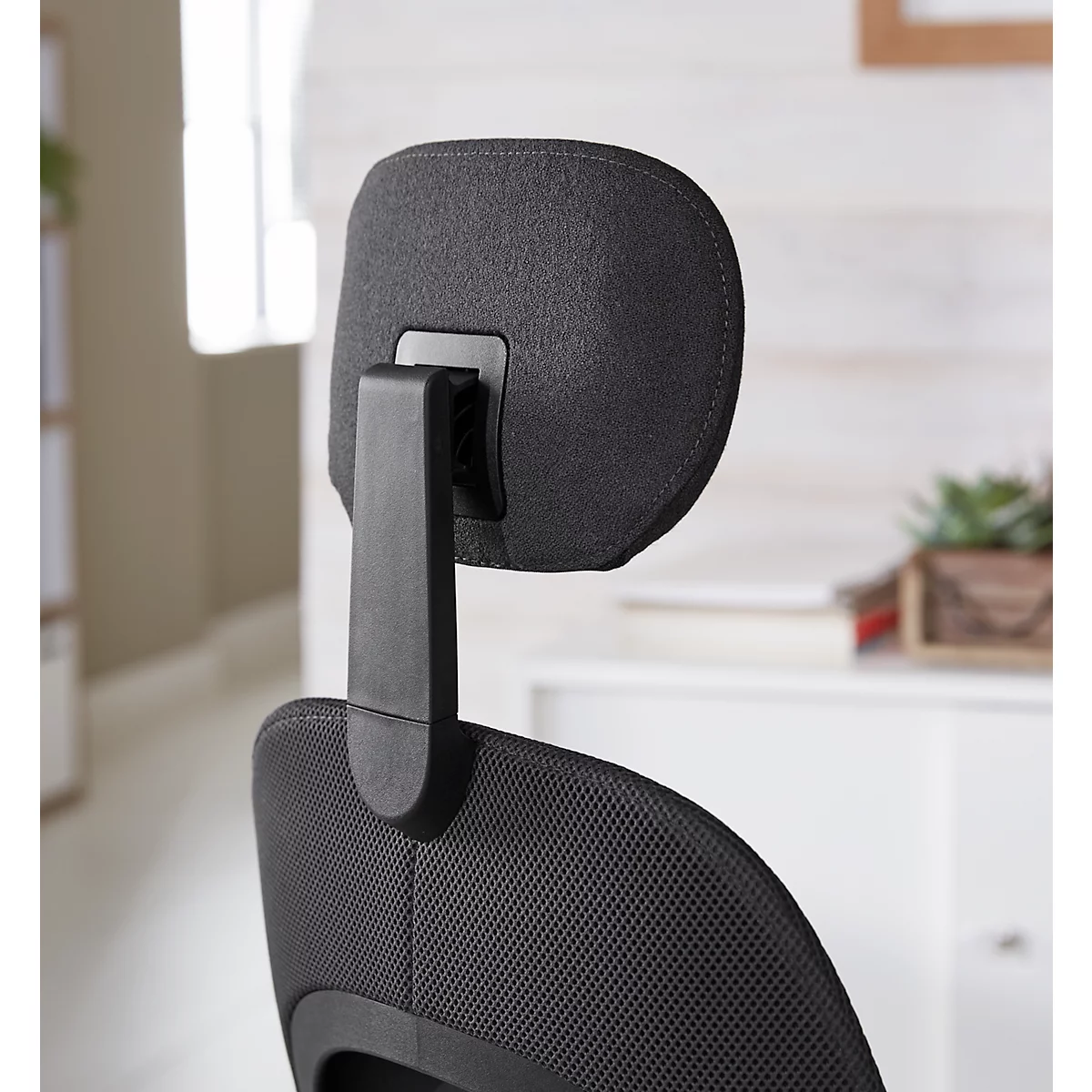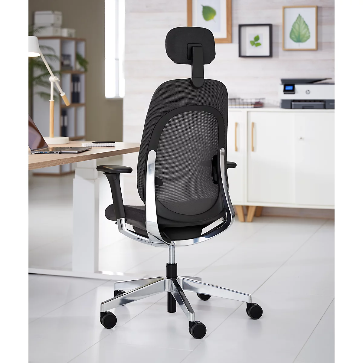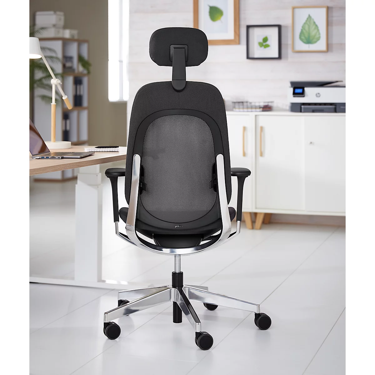 Die Rückenlehne zählt mit einer Höhe von 620 mm zu den eher größeren Exemplaren. Eine höhenverstellbare Lordosenstütze entlastet den Rücken genau da, wo er vielen Menschen Probleme bereitet: im Lendenwirbelbereich. Weniger Hitzestau, eine bessere Luftzirkulation, gutes Rückenklima: Der atmungsaktive Netzrücken ist ein weiteres Highlight des Bürostuhls. Wenn Sie Ihren Kopf für eine lange Zeit in derselben Position halten müssen, sorgt das für eine hohe Belastung – die Kopfstütze ist besonders komfortabel für Arbeiten, bei denen Sie z. B. mehrere Monitore im Blick haben müssen.