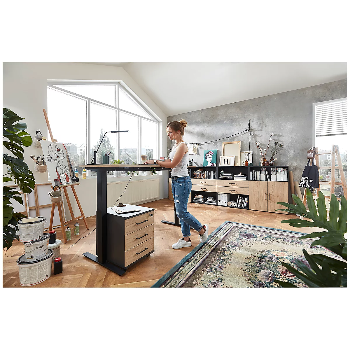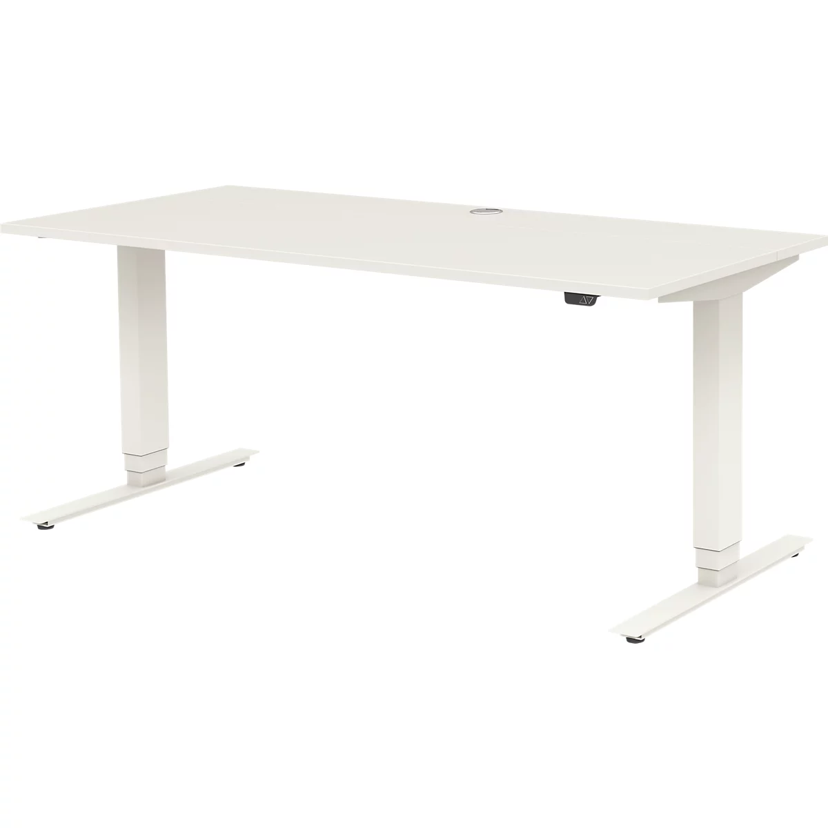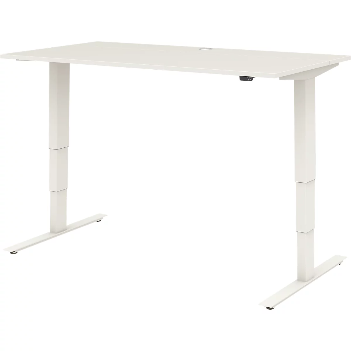 Ganz gleich, ob Heimarbeitsplatz oder ambitioniertes Startup-Unternehmen – die Einrichtung muss jederzeit sowohl in pucto Funktionalität als auch in Bezug auf das optische Gesamtbild überzeugen. Genau dafür steht der elektrisch höhenverstellbare Schreibtisch TEMPIO in den Maßen B 1600 x T 700 mm. Geradlinig, schlicht, optimal ausgeschöpfte Arbeitsfläche – die rechteckige Tischform ist ein echter Klassiker für Büroräume aller Art und fügt sich obendrein wunderbar in fast jede Einrichtung ein. Da Ihr Tisch mit einer melaminharzbeschichteten Spanplatte und Stoßkanten aus ABS-Kunststoff aufwartet, setzen Sie auf ein zuverlässiges Produkt, das pflegeleichte, widerstandsfähige und langlebige Eigenschaften besitzt. In Weiß wirkt der Rechtecktisch außerordentlich hell und zeitgemäß. Mit einem Gestell in Weiß bekommen wir einen runden Ausklang. Ein fester, wackelfreier Stand – keine Herausforderung für das pulverbeschichtete Metall-Gestell in T-Fuß-Form mit Nivellierungsschrauben. 640 bis 1280 mm: In diesem Bereich können Sie die zweistufige Höhenverstellung des Schreibtischs TEMPIO elektrisch verändern. Verwenden Sie den Tisch abwechselnd als Steh- oder Sitzarbeitsplatz. Sie unterstützen eine muntere, gesunde Körperhaltung und erhöhen Ihren Schaffensdrang nachhaltig. Darüber hinaus erfreuen Sie sich an einer Knieraumblende und einer geteilten Tischplatte mit integrierter Klappe, dank der Sie ganz einfach zum Kabelmanagement gelangen, ohne unter den Tisch klettern zu müssen.