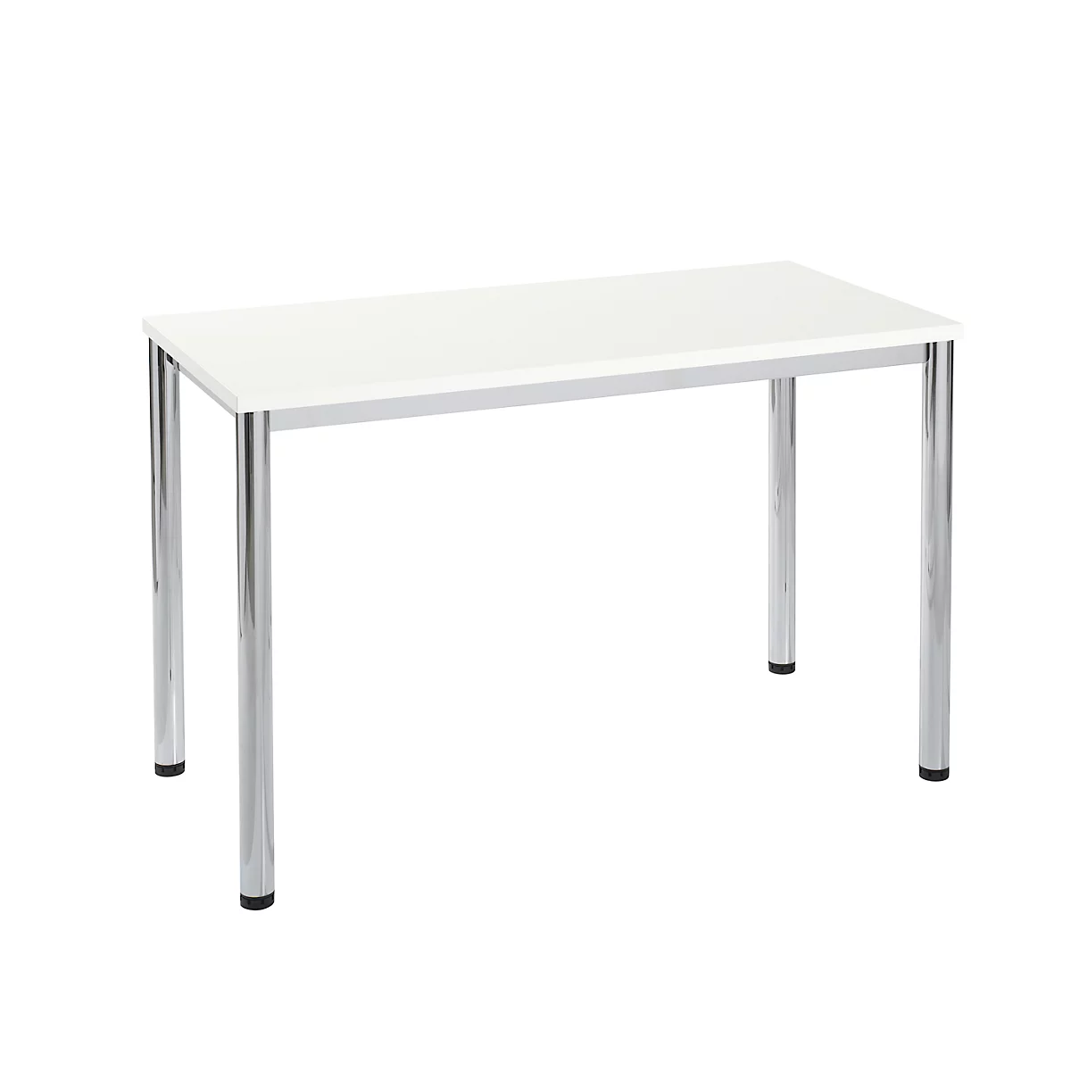 Wie wäre es mit einem 1200 mm breiten und 600 mm tiefen Schreibtisch, der sich aufgrund seiner geringen Abmessungen sowie seiner Formschönheit besonders für das Homeoffice eignet? Wo man auch hinsieht, Tische in rechteckiger Form findet man überall. Das liegt daran, dass sie sich wegen ihrer schlichten Geradlinigkeit nahtlos in bestehende Einrichtungen integrieren lassen und in der Berufswelt vor allem mit einer großen Arbeitsfläche punkten. Gefertigt wird der Tisch aus einer melaminharzbeschichteten Spanplatte mit Kunststoffumleimer, die ihn vor Kratzern schützt und dabei leicht abwischbar ist. Farben rufen unterschiedliche Assoziationen und Empfindungen hervor. Die Farbvariante in Weiß weckt das Gefühl von Klarheit, welches einem offenen und hellen Raum zugute kommt. Das Gestell in Chromsilber sorgt für einen tollen Akzent. Das verchromte 4-Fuß Rundrohr-Gestell aus Stahl setzt Ihre Erwartungen einwandfrei um.