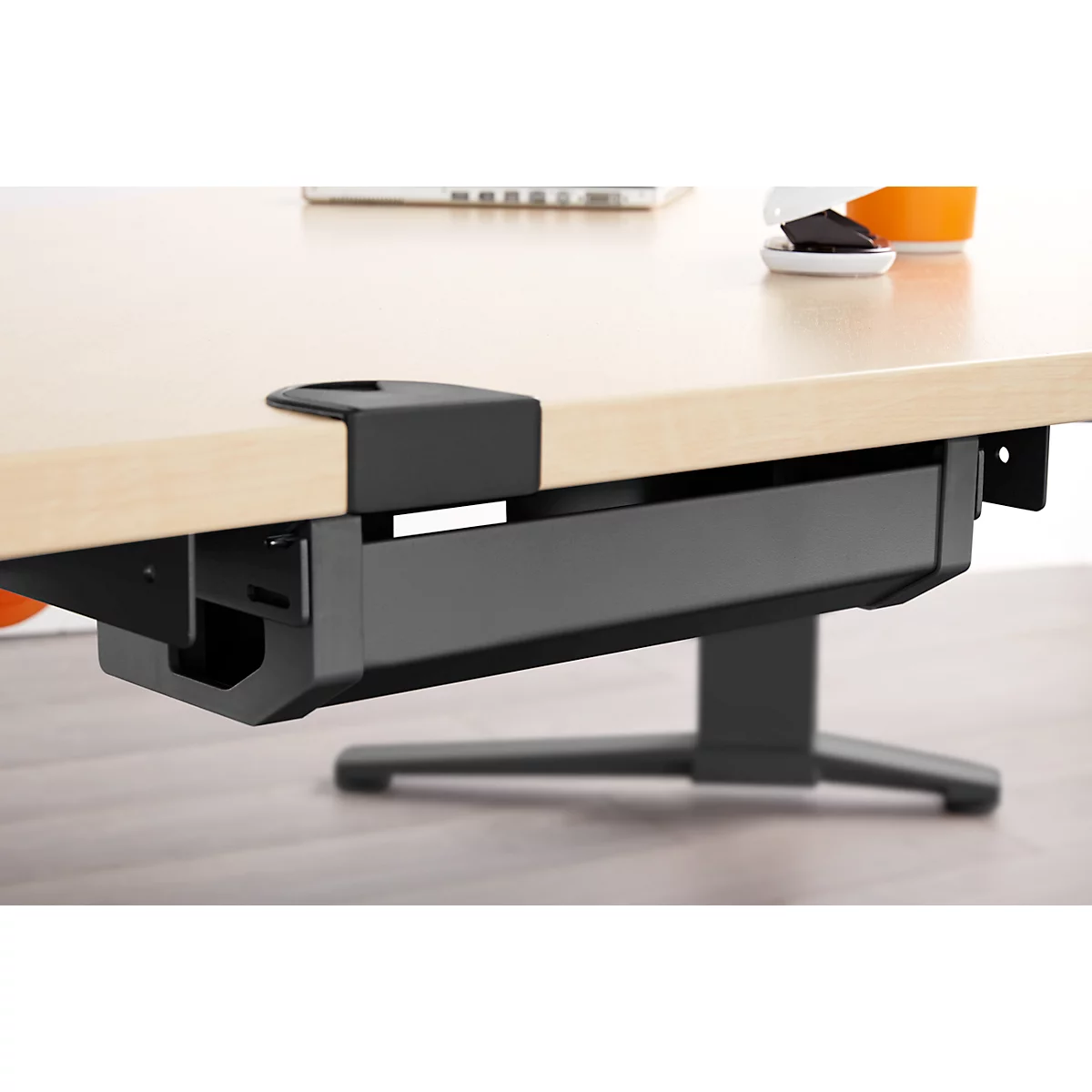 Statten Sie Ihre ERGO-T 2.0 Schreibtische mit einem praktischen Kabelkanal aus. Die horizontale Kabelführung sorgt dafür, dass der Kabelsalat von PC, Monitor und Co. gut verdeckt und ordentlich unter der Tischplatte verschwindet und damit nicht mehr stört.