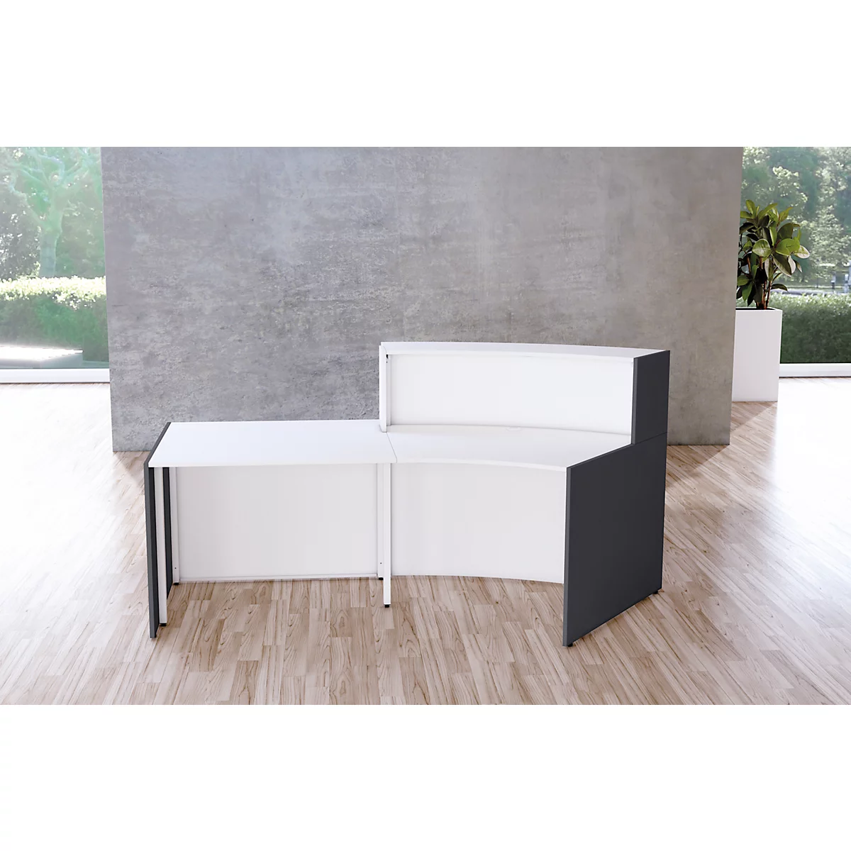 Die kleine Bogen-Empfangstheke Faro mit Beratungsplatz vereint Funktionalität und Ästhetik in einer robusten Holz-/Stahlkonstruktion. Ihre melaminharzbeschichteten und stoßfesten Plattenwerkstoffe, gepaart mit der pulverbeschichteten Stahlblechfront, ergeben eine dauerhaft robuste und pflegeleichte Lösung. Die elegante Bogenform und die dekorativen Edelstahlstreifen an der Thekenfront setzen in jedem Empfangsbereich ein Statement.