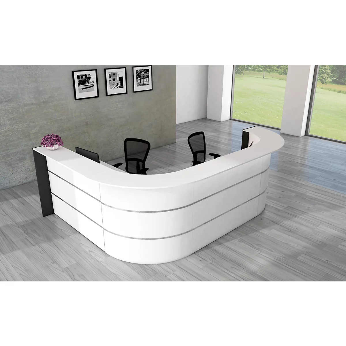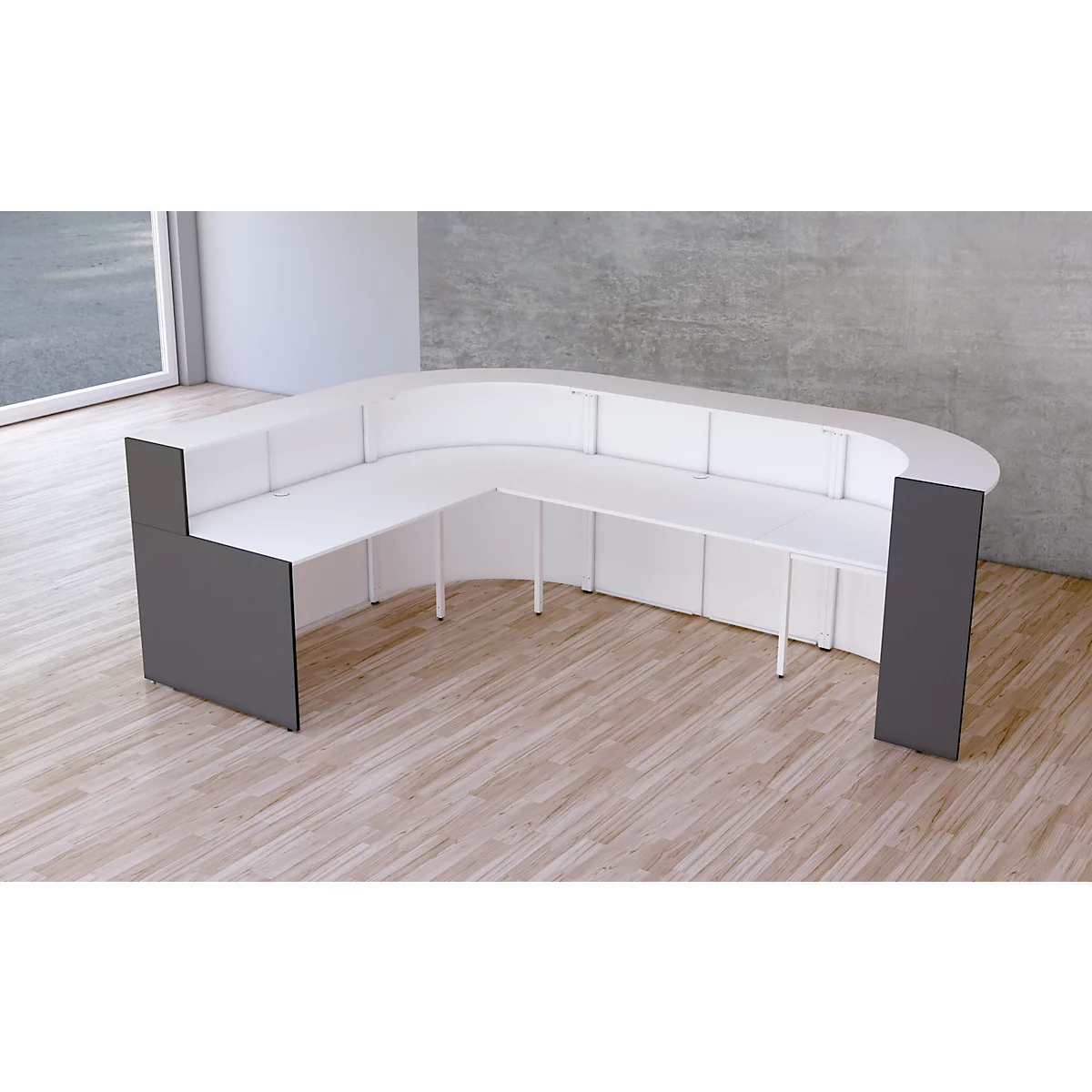 Zusätzlich kann die Faro L-Theke mit einem geräumigen Stauraum-Element ausgestattet werden, das mit einem verstellbaren Fachboden und einer verschließbaren Tür für optimale Organisation sorgt. Halten Sie Ihre Unterlagen, Ordner und persönlichen Gegenstände stets griffbereit.