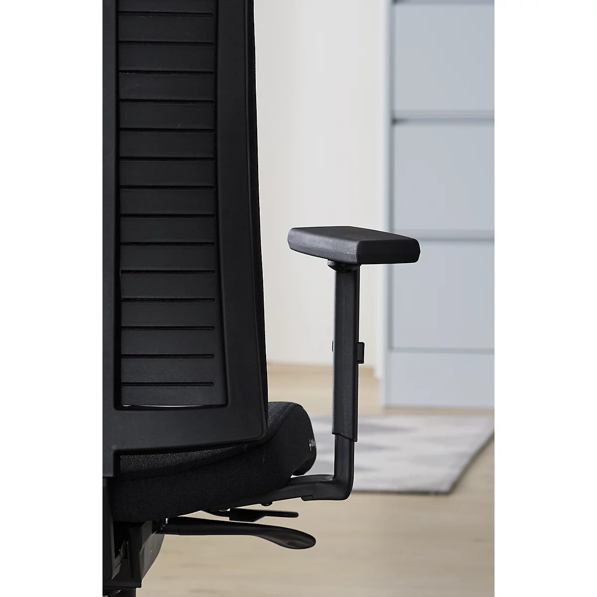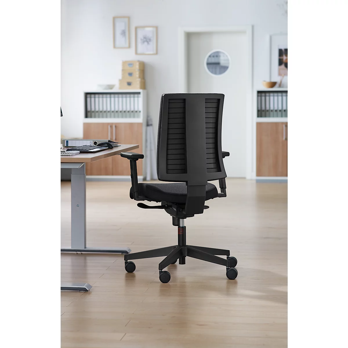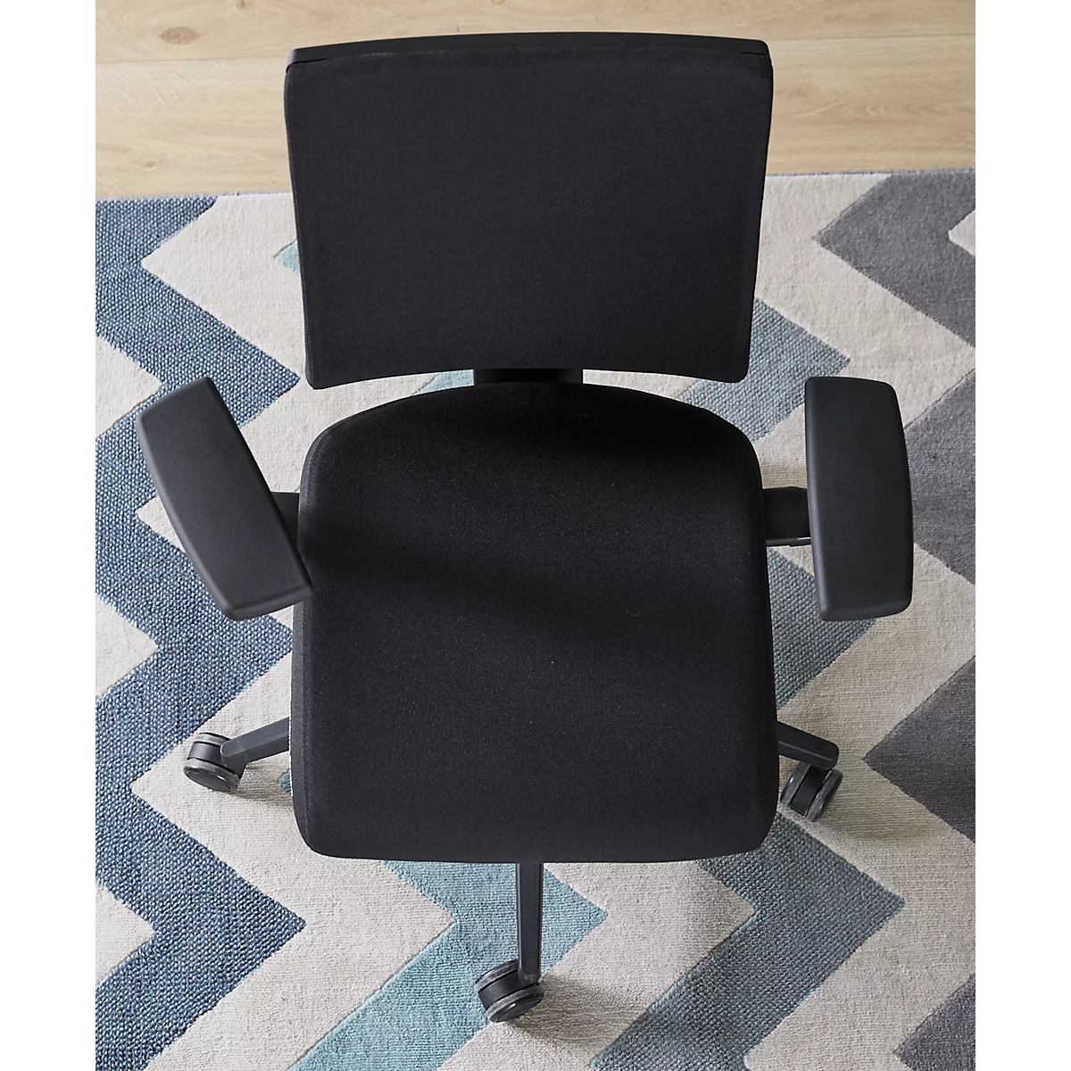 Besonders pflegeleicht und vielseitig ist der Stoffbezug des Modells. Ganz einfach regelmäßig absaugen und einmal im Jahr mit einem Polsterreiniger behandeln. So hält der Bezug seine schöne Farbe und sieht auch nach Jahren noch gepflegt aus. Um Verspannungen im Nacken- und Schulterbereich zu vermeiden, sind Bürostühle mit Armlehnen eine gute Wahl. Bei diesem Modell bieten die Armlehnen mit angenehmen PU-Auflagen zudem noch zusätzlichen Komfort. Mit einem Fußkreuz aus Polyamid setzen Sie auf einmaliges Design und Qualität. Durch die Verwendung von lastabhängig gebremsten Sicherheitsdoppelrollen eignet sich der Stuhl für weiche Untergründe wie langflorige Teppichböden oder Läufer.