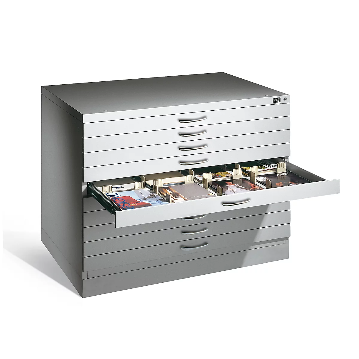 Dieser auf einer stabilen Stahlkonstruktion fußende Planschrank ist Ihnen eine große Hilfe bei der Archivierung großformatiger Unterlagen wie Zeichnungen, Postern oder Bau- und Konstruktionsplänen – und er sorgt für eine glasklare Übersicht.
