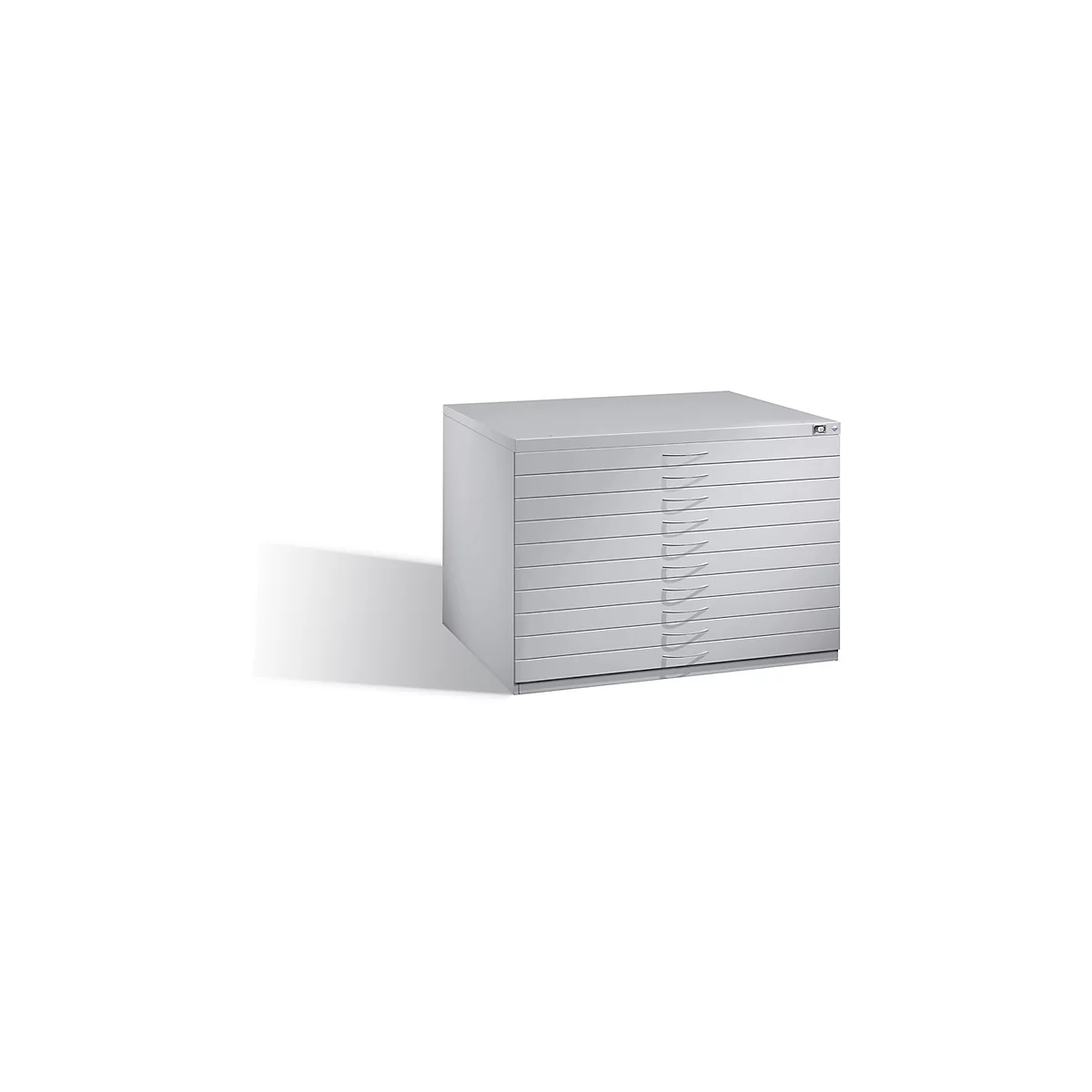 Der Planschrank für Formate bis DIN A1 bietet Ihnen viel Komfort beim Archivieren der verschiedensten Unterlagen mit Überformat. Alle zehn Schubladen sind mit dem ESE-System® für einen End-Selbst-Einzug ausgestattet und zudem voll ausziehbar, wodurch das Handling der Schubladen und deren Inhalte sehr bequem vonstatten geht. Alle zehn Schubladen verfügen über eine normale Blendhöhe. Die stabile Stahlkonstruktion mit aufschlagenden Schubladenblenden sorgt für eine gute Standfestigkeit. Alle Auszüge verfügen vorne über einen Niederhalter und hinten ist eine Deckleiste angebracht. Dank gerasterter sowie unterteilbarer Schubladenböden ist dieser Flachablageschrank für die unterschiedlichsten Anwendungen geeignet. Elegante und ergonomische Bügelgriffe erleichtern das Öffnen der einzelnen Schubladen. Durch optional erhältliches Zubehör wie einem Sockel oder einem Untergestell stehen Ihnen mit diesem Planschrank viele Kombinationsmöglichkeiten offen.