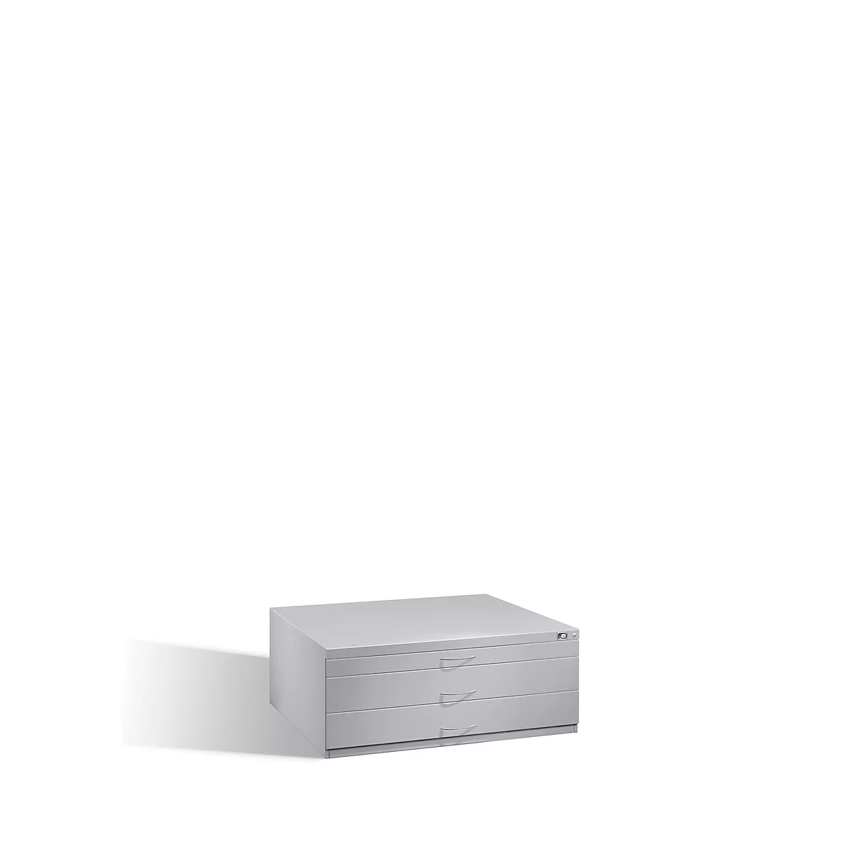 Der Planschrank für Formate bis DIN A1 bietet Ihnen viel Komfort beim Archivieren der verschiedensten Unterlagen mit Überformat. Alle drei Schubladen sind mit dem ESE-System® für einen End-Selbst-Einzug ausgestattet und zudem voll ausziehbar, wodurch das Handling der Schubladen und deren Inhalte sehr bequem vonstatten geht. Eine Schublade verfügt über eine normale Blendhöhe, die anderen beiden haben eine doppelte Blendhöhe. Die stabile Stahlkonstruktion mit aufschlagenden Schubladenblenden sorgt für eine gute Standfestigkeit. Alle Auszüge verfügen vorne über einen Niederhalter und hinten ist eine Deckleiste angebracht. Dank gerasterter sowie unterteilbarer Schubladenböden ist dieser Planschrank für die unterschiedlichsten Anwendungen geeignet. Elegante und ergonomische Bügelgriffe erleichtern das Öffnen der einzelnen Schubladen. Durch optional erhältliches Zubehör wie einem Sockel oder einem Untergestell stehen Ihnen mit diesem Planschrank viele Kombinationsmöglichkeiten offen.