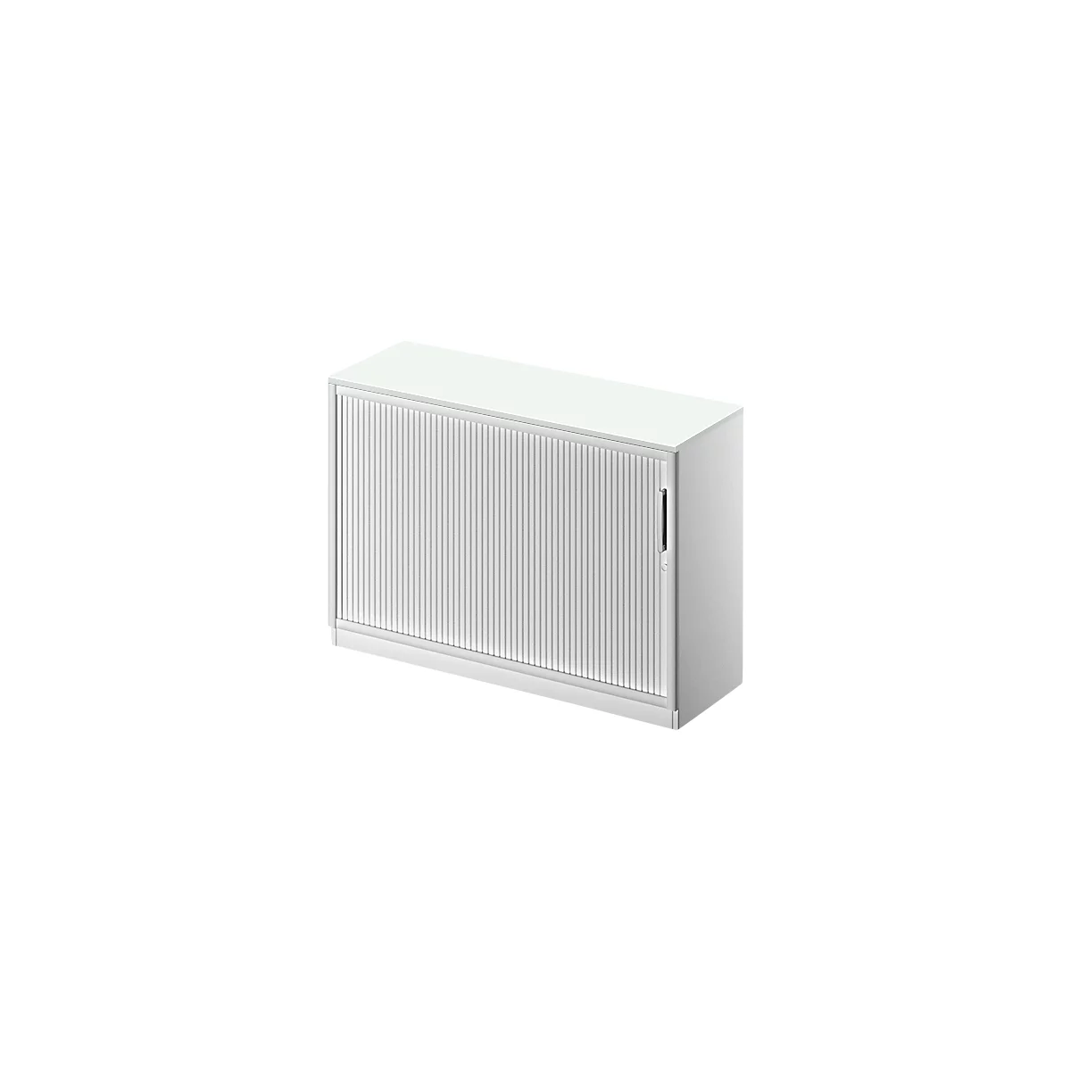 Auf zwei Ordnerhöhen bietet dieser Schrank rund zwei Laufmeter Platz für Unterlagen und Materialien, die sich hinter dem abschließbaren Rollladen sicher verstauen lassen. Mit einem silbernen Griff versehen, lässt sich die Jalousie ganz öffnen und verschwindet dabei im Schrank.