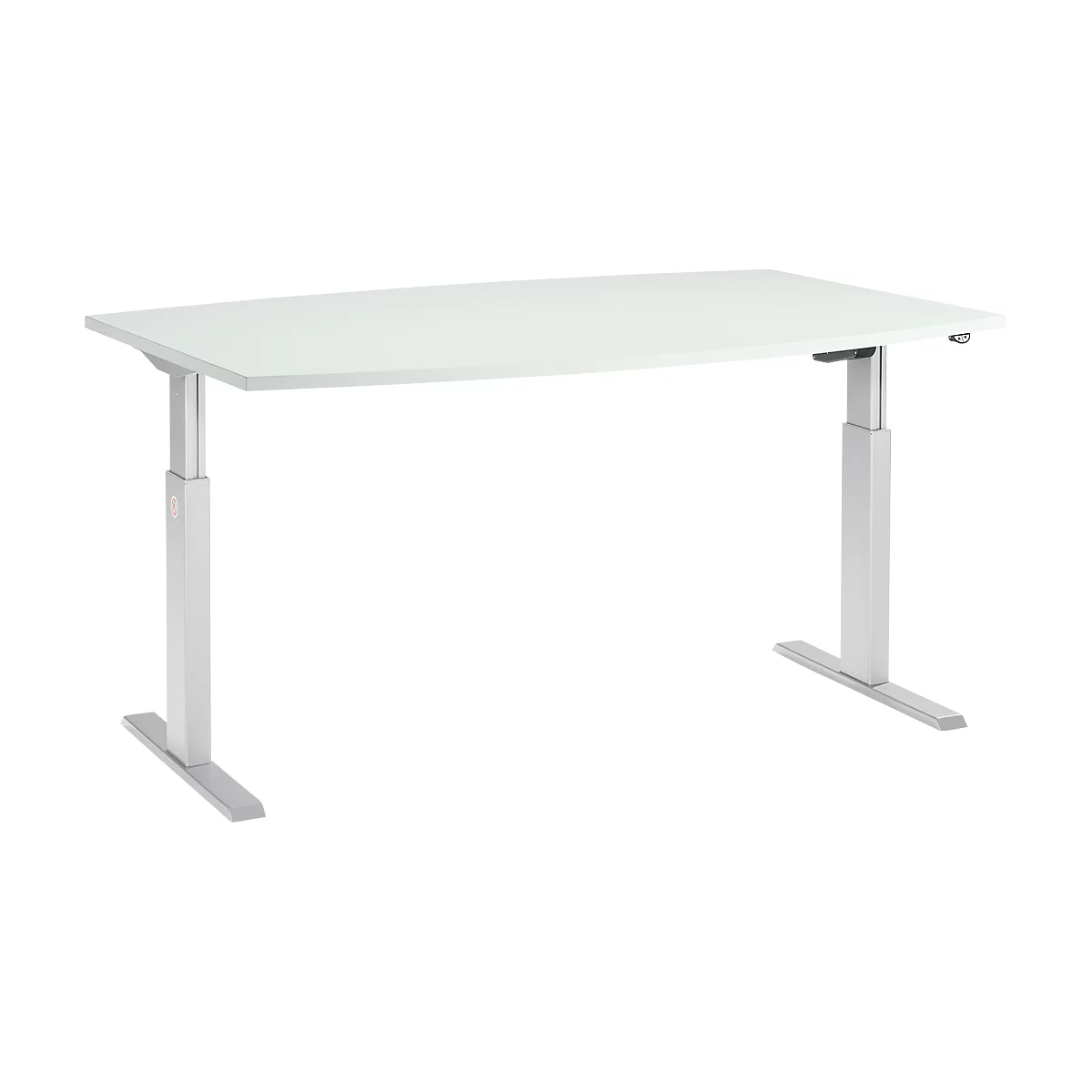 Der Besprechungstisch ERGO-T mit den Abmessungen B 2000 x T 1000 mm ist elektrisch höhenverstellbar und ist besonders variabel, modern und durchdacht für insbesondere große Unternehmen oder Großraumbüros, bei denen ein Upgrade des Mobiliars bevorsteht. Ein Tisch in Bootsform verschafft einen harmonischen Eindruck, er sorgt für Nähe in Gesprächen mit Geschäftspartnern oder Klienten und eignet sich auch besonders für Konferenzen und sonstige Besprechungen. Wählen Sie das Dekor in Lichtgrau, wirkt der Tisch modern und dennoch zurückhaltend. Er lässt sich harmonisch mit anderen Farben und somit Büromöbeln kombinieren. Ein Gestell in Weißaluminium vervollständigt das Erscheinungsbild. Das robuste T-Fuß-Gestell aus pulverbeschichtetem Stahl mit Gleitern nimmt die Tischplatte auf. Zum Nivellieren von Bodenungleichmäßigkeiten drehen Sie einfach die Ausgleichsschrauben in den Füßen. Die verlängerbaren Gestellbeine verfügen über eine einstufige elektrische Höhenverstellbarkeit im Bereich von 725 bis 1185 mm. Legen Sie während der Arbeitszeit hin und wieder sitzende und stehende Phasen ein. Auf Dauer erweisen Sie Ihrem Körper – vor allem Ihrem Rücken – eine große Wertschätzung. Genießen Sie die lockere Beinfreiheit, da der Tisch ohne störende Quertraverse auf Beinhöhe kommt.