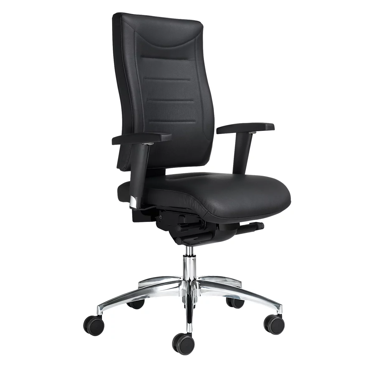 Eine besonders hochwertige Polsterung sorgt für angenehmes Sitzen und optimalen Komfort. Wer auf Eleganz im Büro setzt, der ist mit diesem Modell in Lederoptik bestens beraten. Das ansprechende Design wird durch ein Fußkreuz aus Aluminium abgerundet. Die Doppelrollen eignen sich für alle Untergründe, sodass Sie den Stuhl sowohl auf Teppichböden als auch Hartböden wie Fliesen, Parkett oder Laminat verwenden können.