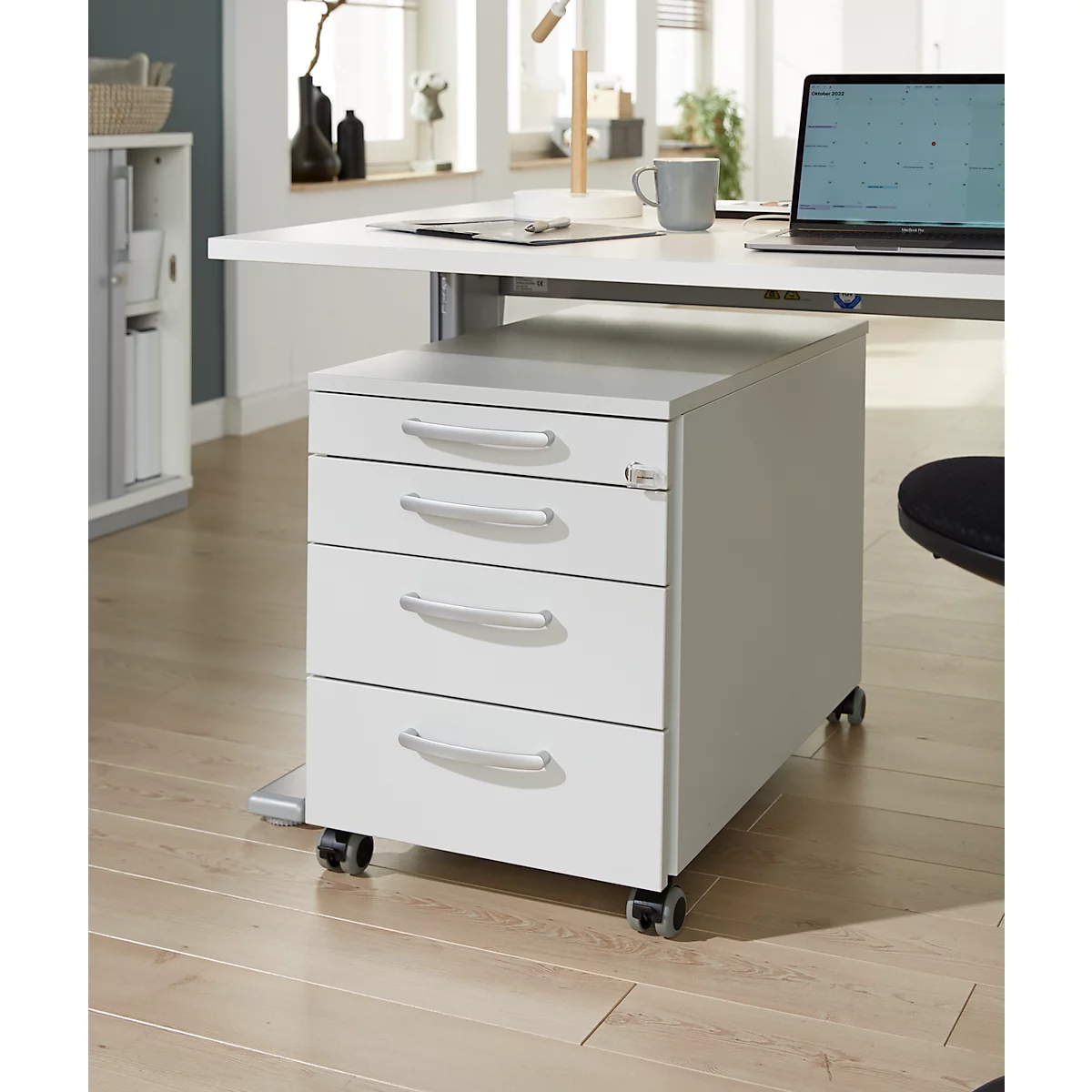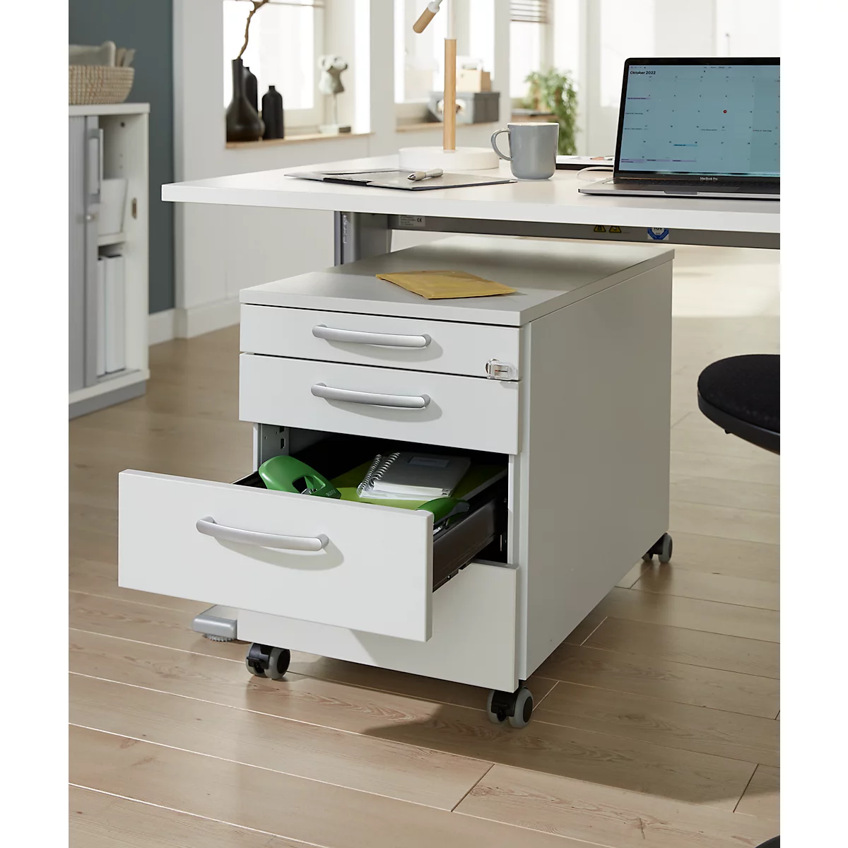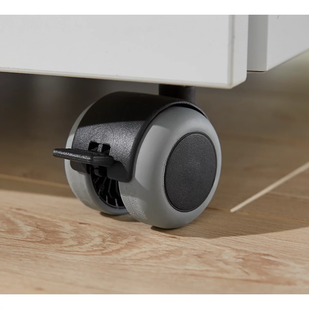 Der Rollcontainer 1233 von Schäfer Shop Select bietet Ihnen im Büro und am Arbeitsplatz zusätzlichen Stauraum für wichtige Dokumente und Utensilien. Hierfür ist er mit 3 Schubladen und einem praktischen Utensilienauszug ausgerüstet. Die runden Griffe ermöglichen einen unkomplizierten Zugriff, die vier Leichtlaufrollen sorgen für einen flexiblen Standortwechsel. Zwei der Rollen sind mit Feststellern versehen.