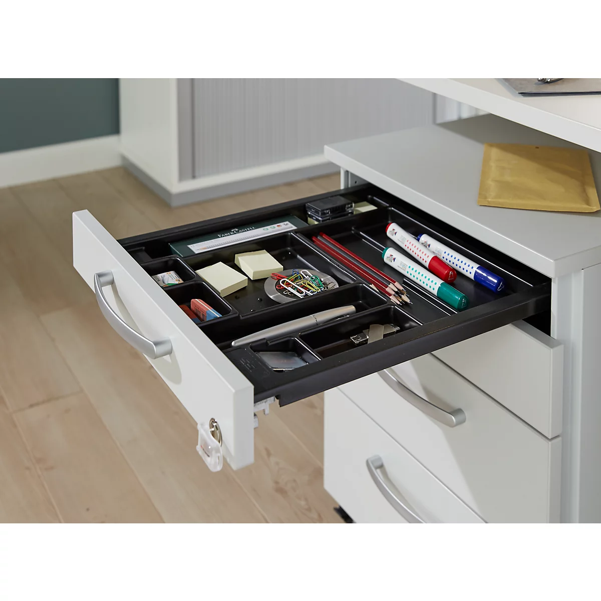 Dank des Zentralverschlusses lassen sich die sich im Rollcontainer 1233 verwahrten Unterlagen und Arbeitsmaterialien bestens vor dem Zugriff durch Unbefugte schützen. Ein passender Kippschlüssel ist im Lieferumfang bereits mit enthalten.