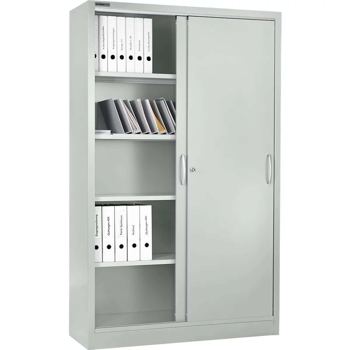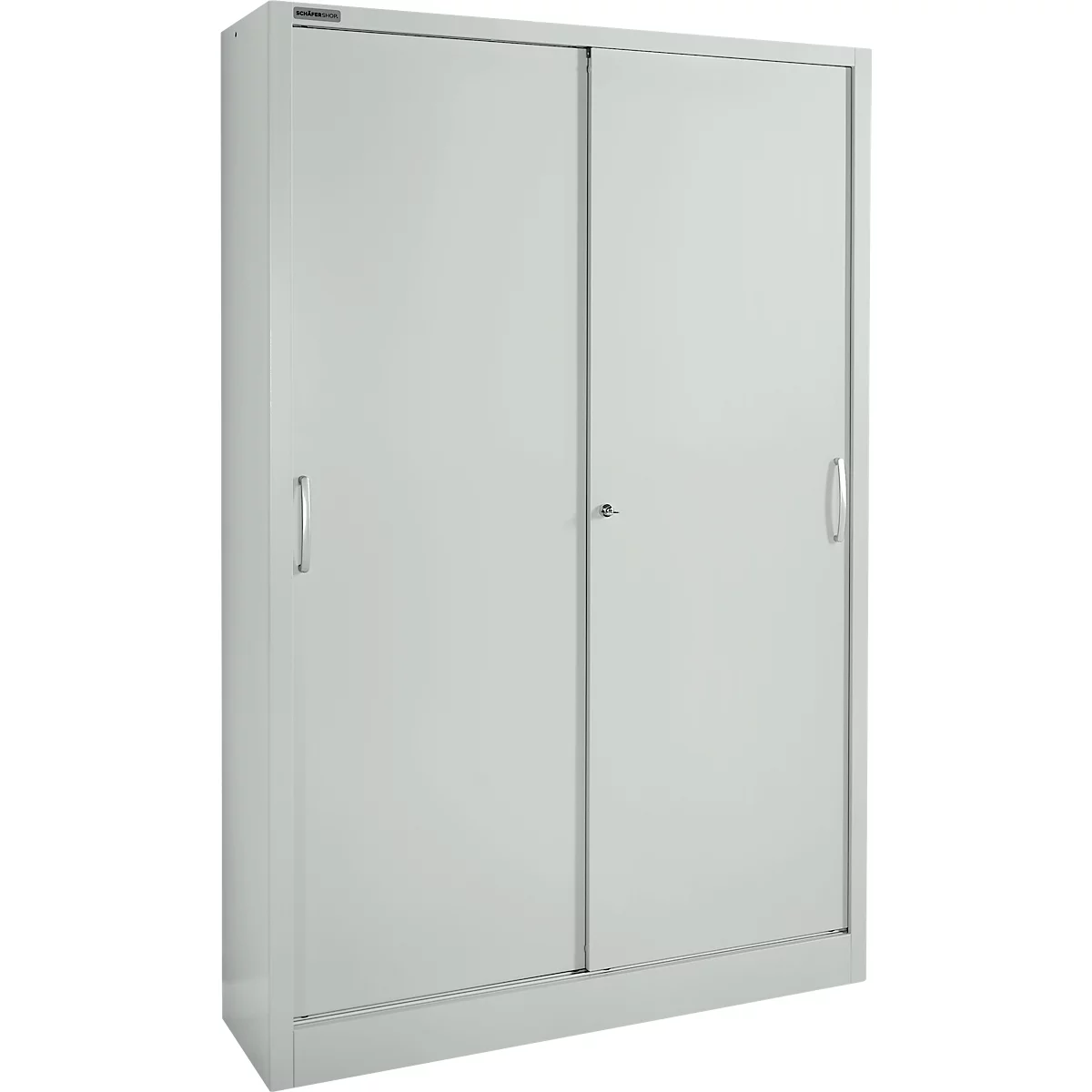 Der Schiebetürenschrank MS iCONOMY besteht aus Stahl und hat eine Extrabreite von 1200 mm. Bei einer Höhe von 1935 mm bietet der Schiebetürenschrank MS iCONOMY insgesamt fünf Fachböden in Ordnerhöhe.