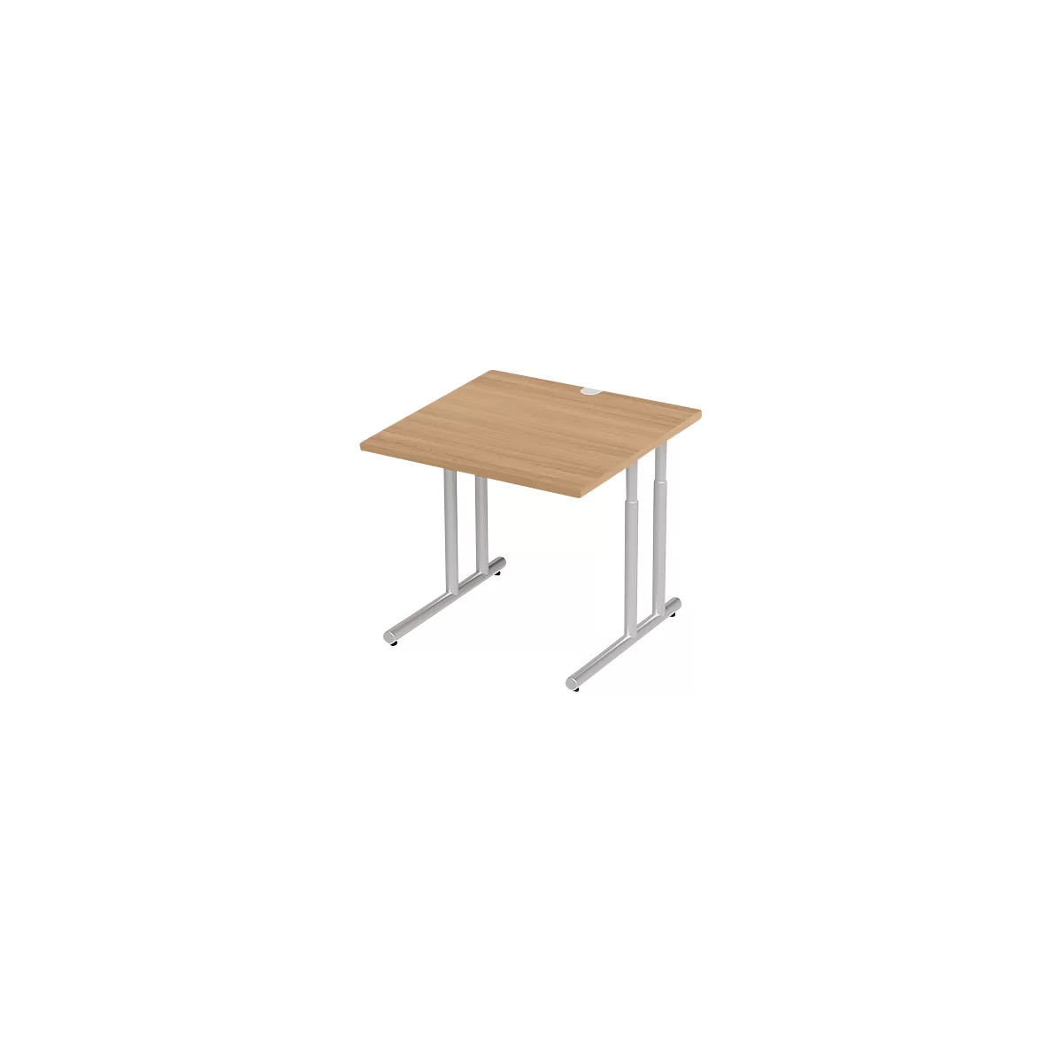 Für Tatkräftige kommt es auf eine solide Grundlage an. Eine solche ist der B 800 x T 800 mm große Schreibtisch COMBITEC, der sich vor allem im Großraumbüro clever durch zeitgemäße Erscheinung und Flexibilität auszeichnet. Durch die quadratische Form ist der geradlinige Tisch besonders als Anbau- oder Verbindungselement geeignet. Die Spanplatte mit beidseitig melaminharzbeschichteter Oberfläche und 3 mm Kantenschutz aus Kunststoff ist sehr strapazierfähig und für einen dauerhaften Einsatz gut gewappnet. Nicht zu unterschätzen ist die farbliche Komponente. Betrachten wir das Farbdekor in Kirsche Romana. Es erzeugt eine helle, warme Stimmung. Eine Steigerung für das körperliche Wohlbefinden. Das Erscheinungsbild schließt ab durch ein Gestell in Weißaluminium. Auf seinem robusten C-Fuß-Gestell aus pulverbeschichtetem Aluminium mit Regulierungsschrauben steht Ihr Tisch an seiner künftigen Wirkungsstätte sicher und wankelfrei justiert. 677 bis 817 mm: In diesem Bereich können Sie die Höheneinstellbarkeit des Schreibtischs COMBITEC variieren. Der Tisch lässt sich aufgrund des einstellbaren Gestells spielend einfach in die gewünschte Höhe bringen, sodass auch größere Personen an ihm bequem im Sitzen arbeiten können. Da sich die stabilisierende Querstange unmittelbar unter der Tischplatte befindet, genießen Sie absolute Beinfreiheit. Verknotete oder ungeordnete Kabel, die im Weg herumhängen, waren gestern! Verstecken Sie Kabel in der praktischen Kabelführung durch einen Kabeldurchlass in der Tischplatte in den Kabelklemmen und führen Sie diese unauffällig zu Steckdosen und Anschlüssen bspw. im Boden.
