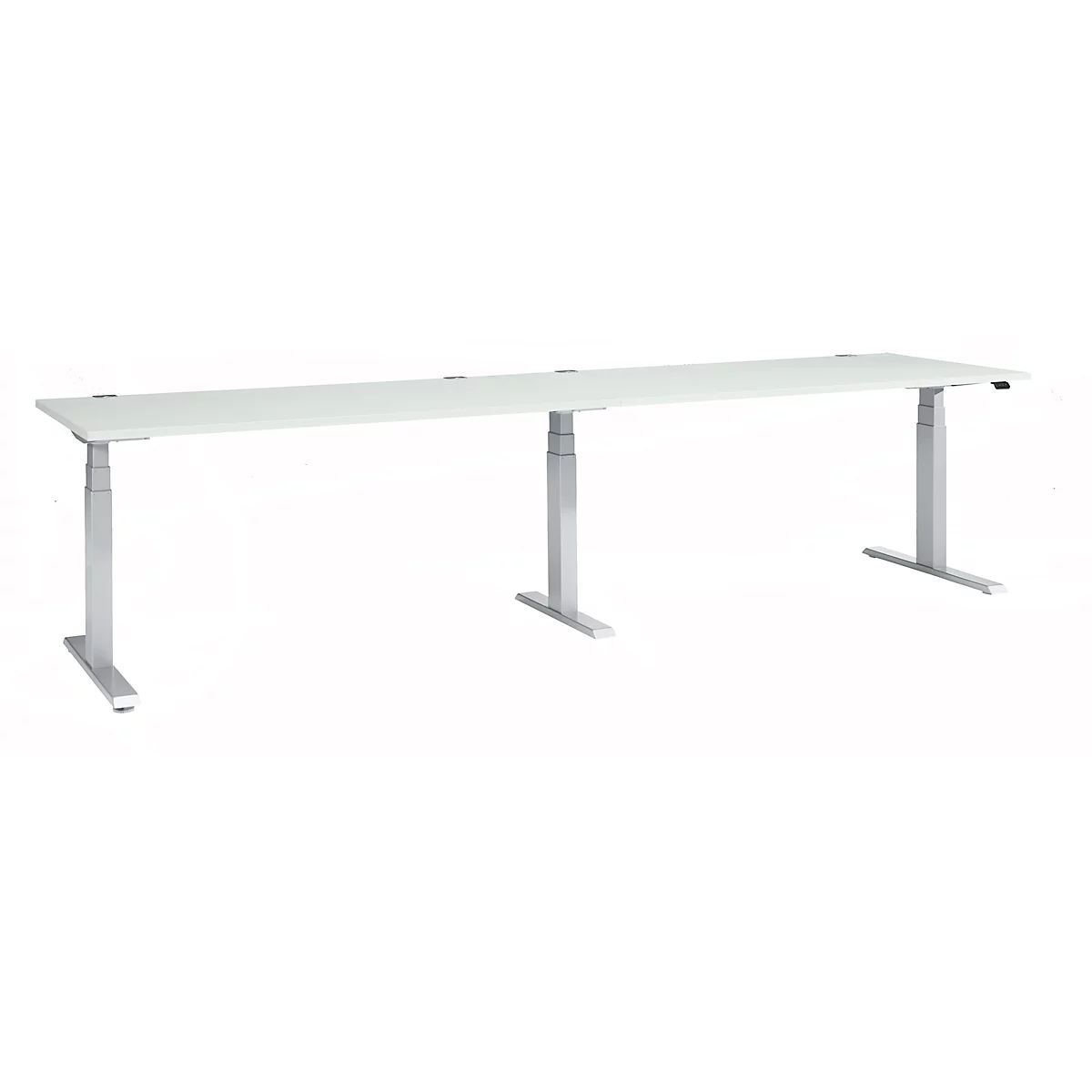 Durchdacht handeln und gleichsam stets variabel bleiben – diese Maxime zeichnet insbesondere große, moderne Unternehmen mit vielen Mitarbeitern aus. Sie auch persönlich? So ist dieser elektrisch höhenverstellbare Schreibtisch ERGO-T 2.0 Big in den Abmessungen 3200 x 800 (B x T) mm wie für Sie geschaffen. Die klassische, rechteckige Form hat sich bei Tischen aller Art bewährt. Die Vorteile liegen deutlich auf der Hand: Sie bietet viel Platz zum Arbeiten und ist rundweg mit anderen Büromöbeln oder Tischformen kombinierbar. Hinter der feinen Fertigung weilt die Spanplatte mit Melaminharzbeschichtung und 2 mm Stoßkanten aus Kunststoff, die ihn vor Kratzern schützt und dabei leicht abwischbar ist. Farben rufen unterschiedliche Assoziationen und Empfindungen hervor. Die Farbvariante in Lichtgrau ist eher neutral und unauffällig, sodass andere Farbtöne mehr zur Geltung kommen dürfen. Das T-Fuß-Gestell aus pulverbeschichtetem Stahl mit Bodenausgleichsschrauben ist sehr solide sowie im Handumdrehen wackelfrei justiert. Es vervollständigt in Weißaluminium das Erscheinungsbild. Profitieren Sie bei diesem Modell von der 2-stufigen elektrischen Höhenverstellung im Intervall von 640 bis 1300 mm. Ausgedehnte Arbeitstage fallen leichter, wenn man sich gelegentlich aus der sitzenden in die stehende Körperhaltung verlagert. Das entspannt Rücken und Nacken und steigert unter anderem Fokus und Leistungsfähigkeit. Strecken Sie ungehindert Ihre Beine aus, da der Tisch ohne störende Quertraverse auf Beinhöhe kommt.