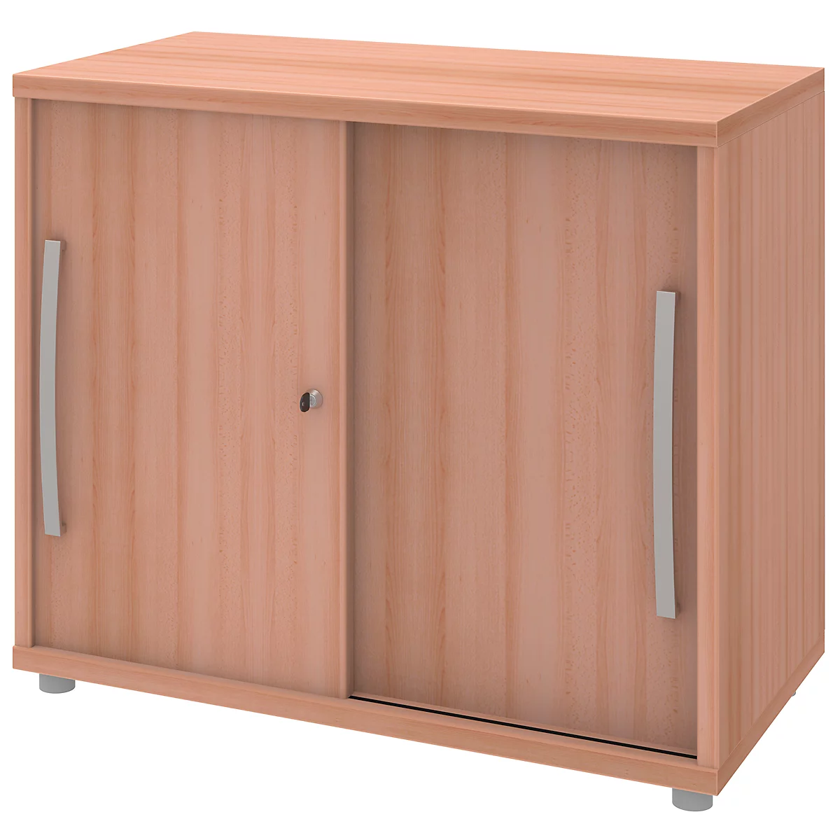Im Inneren ist der Schrank mit einem Einlegeboden ausgestattet. In den zwei Fächern bringen Sie locker unter, was nicht auf dem Schreibtisch gelagert werden soll. Die Open-Desk-Policy Ihrer Firma erfüllen Sie damit ganz leicht. Die attraktiven und platzsparenden Schiebetüren öffnen in gegenläufige Richtungen: Sie verfügen über alufarbene Griffe.