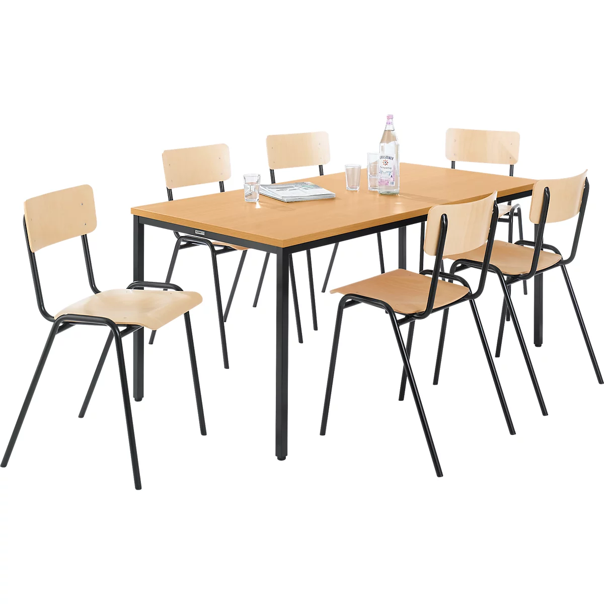 Dieses Sparset besteht aus einem robusten Stahlrohrtisch mit einer Länge von 1600 mm, einer Breite von 800 mm und einer Höhe von 720 mm. Die Platte besteht aus 19 mm starker Buche und ist mit einem Kunststoffbelag sowie einer PVC-Kante ausgestattet. Die 6 dazugehörigen Stühle sind körpergerecht geformt und ermöglichen ein Angenehmes Sitzen. Sie sind 450 mm breit, bei einer Höhe von 770 mm und einer Tiefe von 520 mm. Die Sitzfläche so wie auch die Lehne sind aus Buchensperrholz.