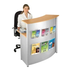 Diese exklusive Empfangstheke überzeugt mit satinierten Glasabdeckungen und lässt sich hervorragend mit den verschiedensten Büromöbelsystemen kombinieren. Optional auch mit Metallblenden und Handläufen erhältlich.