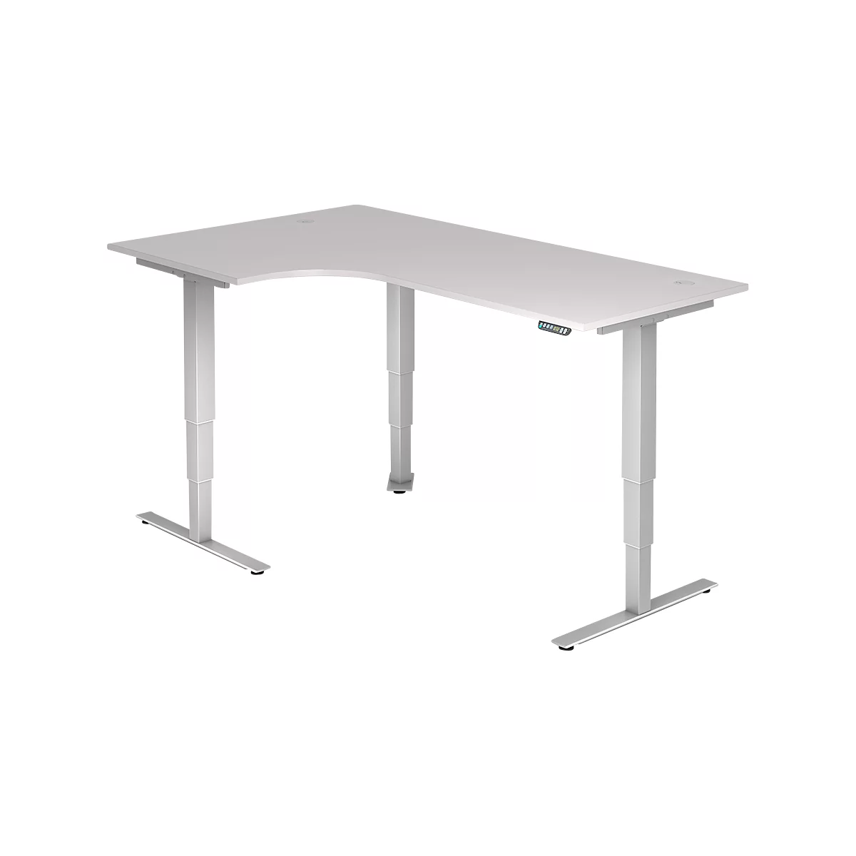 Durchdacht agieren und gleichsam stets variabel bleiben – diese Maxime zeichnet insbesondere große, moderne Unternehmen mit vielen Mitarbeitern aus. Sie auch? Werfen Sie einen Blick auf unseren elektrisch höhenverstellbaren Winkelschreibtisch ULM mit den Abmessungen B 2000 x T 1200/1200,00 mm! Ein Eckschreibtisch ist optimal für Teamarbeitsplätze. Er kann als Abgrenzung zwischen Arbeitsbereichen eingesetzt werden, und ebenso gut platzsparend Ecken ausfüllen. Eine beidseitig melaminharzbeschichtete Spanplatte mit 2 mm ABS-Kantenschutz wappnet Sie für den alltäglichen Einsatz. In Lichtgrau wirkt der Eckschreibtisch modern und dennoch zurückhaltend. Er lässt sich harmonisch mit anderen Farben und Büromöbeln kombinieren. Die Tischplatte fußt fest auf dem robusten T-Fuß-Gestell aus lackiertem Stahl mit Stützfuß. Leichte Bodenunebenheiten gleichen Sie mühelos mit den Nivellierungsschrauben aus. Die verlängerbaren Gestellbeine verfügen über eine zweistufige elektrische Höhenverstellbarkeit im Intervall von 625 bis 1275 mm. Ausgedehnte Arbeitstage fallen leichter, wenn man des Öfteren zwischen Sitzen und Stehen wechselt. Das schont Rücken und Nacken und schafft Beweglichkeit am Arbeitsplatz. Sobald ein Objekt, Kind oder Haustier ins Kreuzfeuer geraten, löst der Kollisionsschutz einen automatischen Stopp aus, bevor dieser beim Verfahren Schaden anrichtet. Darüber hinaus erfreuen Sie sich an einem Memoryschalter mit Displayanzeige und 4 Speicherplätzen, mit dem Sie Ihre bevorzugten Tischhöhen speichern können.